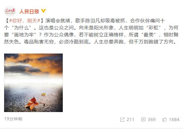 当晚,人民日报发表评:演唱会就绪,歌手陈羽凡却吸毒被抓,合作伙伴痛问十个“为什么”。这也是公众之问。向来是阳光形象,人生明明如“彩虹”,为何要“画地为牢”?作为公众偶像,若不能树立正确榜样,所谓“最美”,顿时黯然失色。毒品贻害无穷,必须冷酷到底。人生总要奔跑,但千万别跑错了方向。